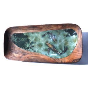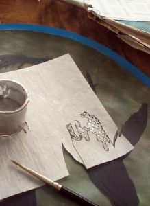 Mirages, 2017, bois d’acacia, avec pigments, feuilles d’aluminium et bronzines.                        56×26.5×5 cm